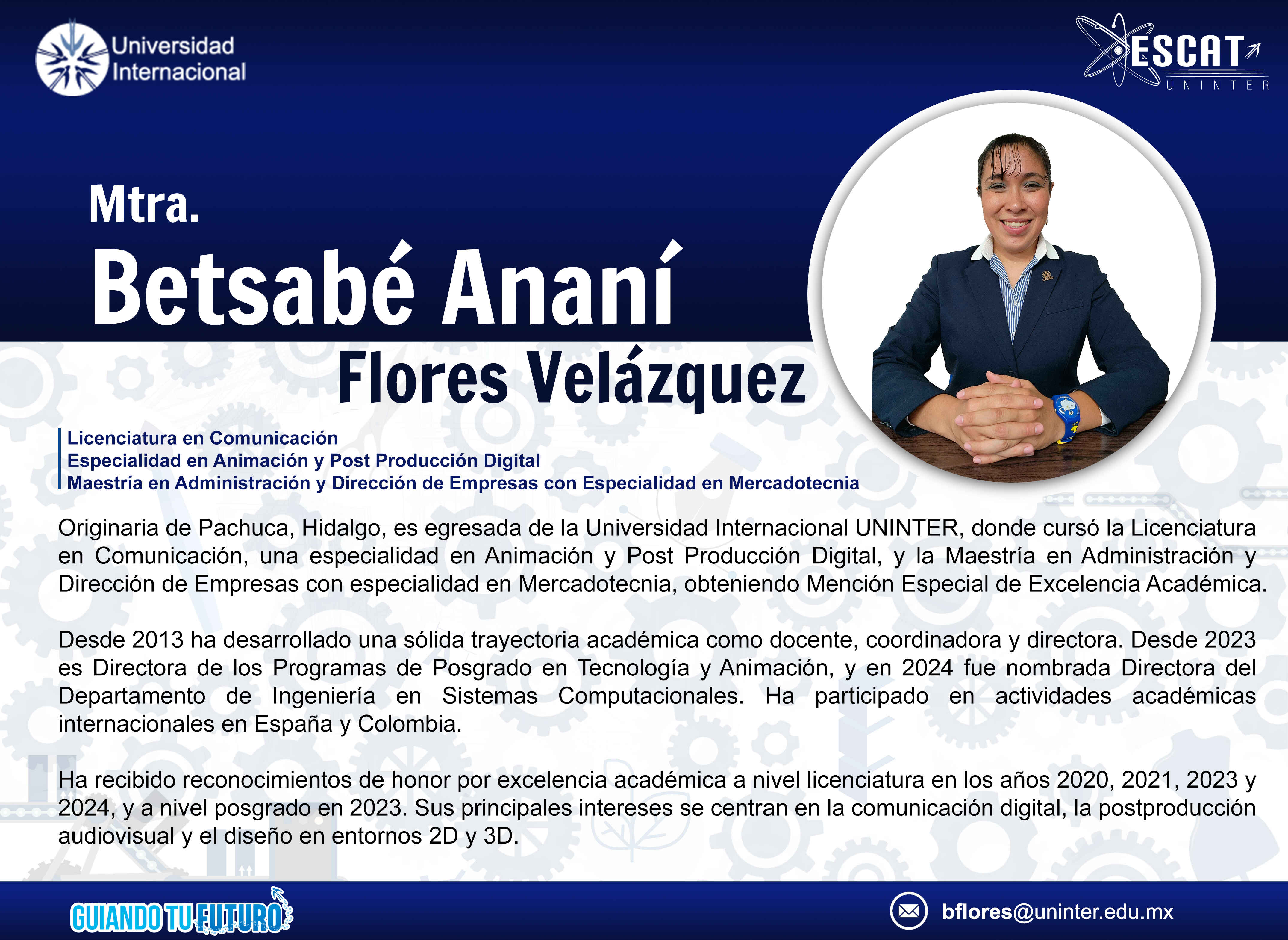 Lic. Betsabé A. Flores Velázquez / Dir. Programas de Posgrados en Tecnología y Animación / Dir. Departamento Académico SC