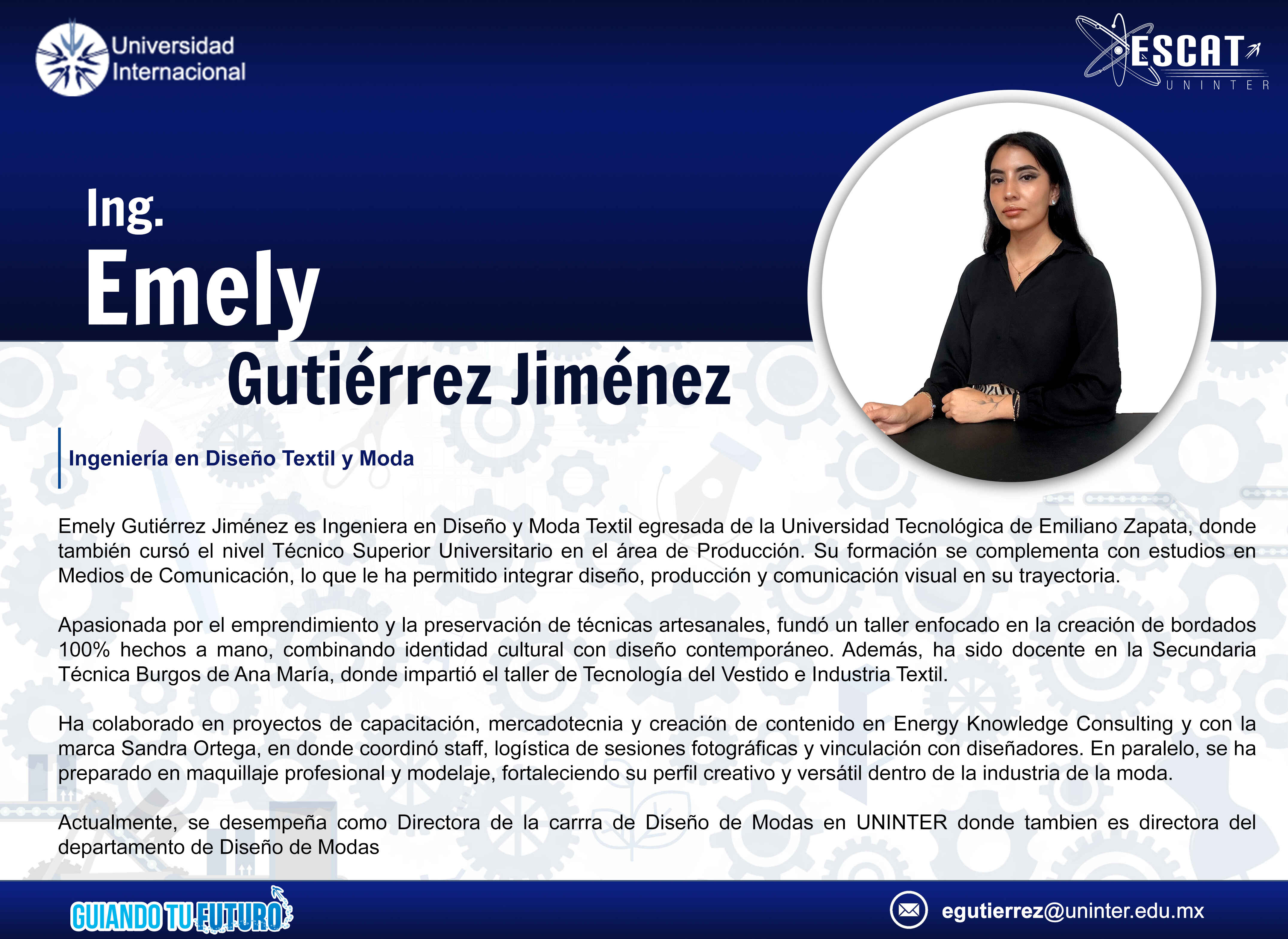 Ing. Emely Gutiérrez Jiménez / Directora de Departamento Académico DS-Modas / Dir. Carrera LDM / Coordinador del Taller de Modas y Costura