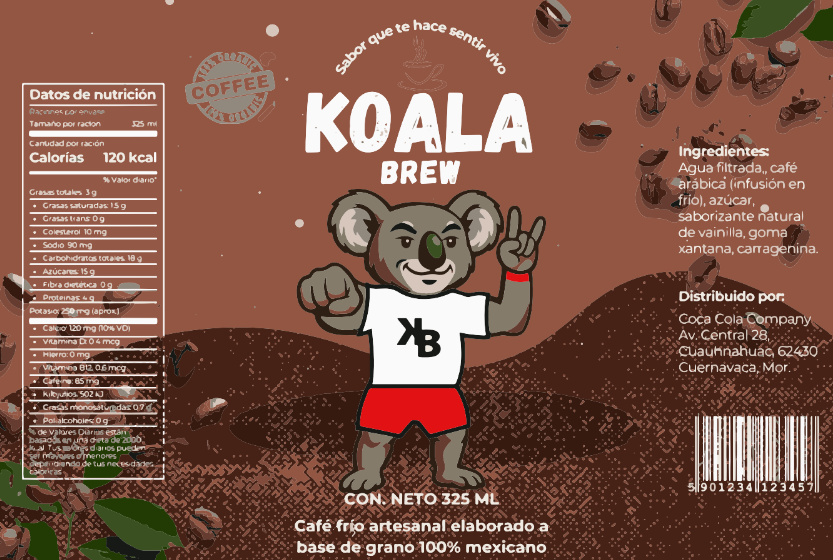 El reto consistió en desarrollar la imagen completa del producto, incluyendo el diseño del empaque, una mascota publicitaria y un logotipo atractivo y funcional. La bebida ficticia “Koala Brew” fue pensada para freelancers, creativos, estudiantes y trabajadores que valoran tanto el diseño como la energía natural, con una estética relajada pero profesional.