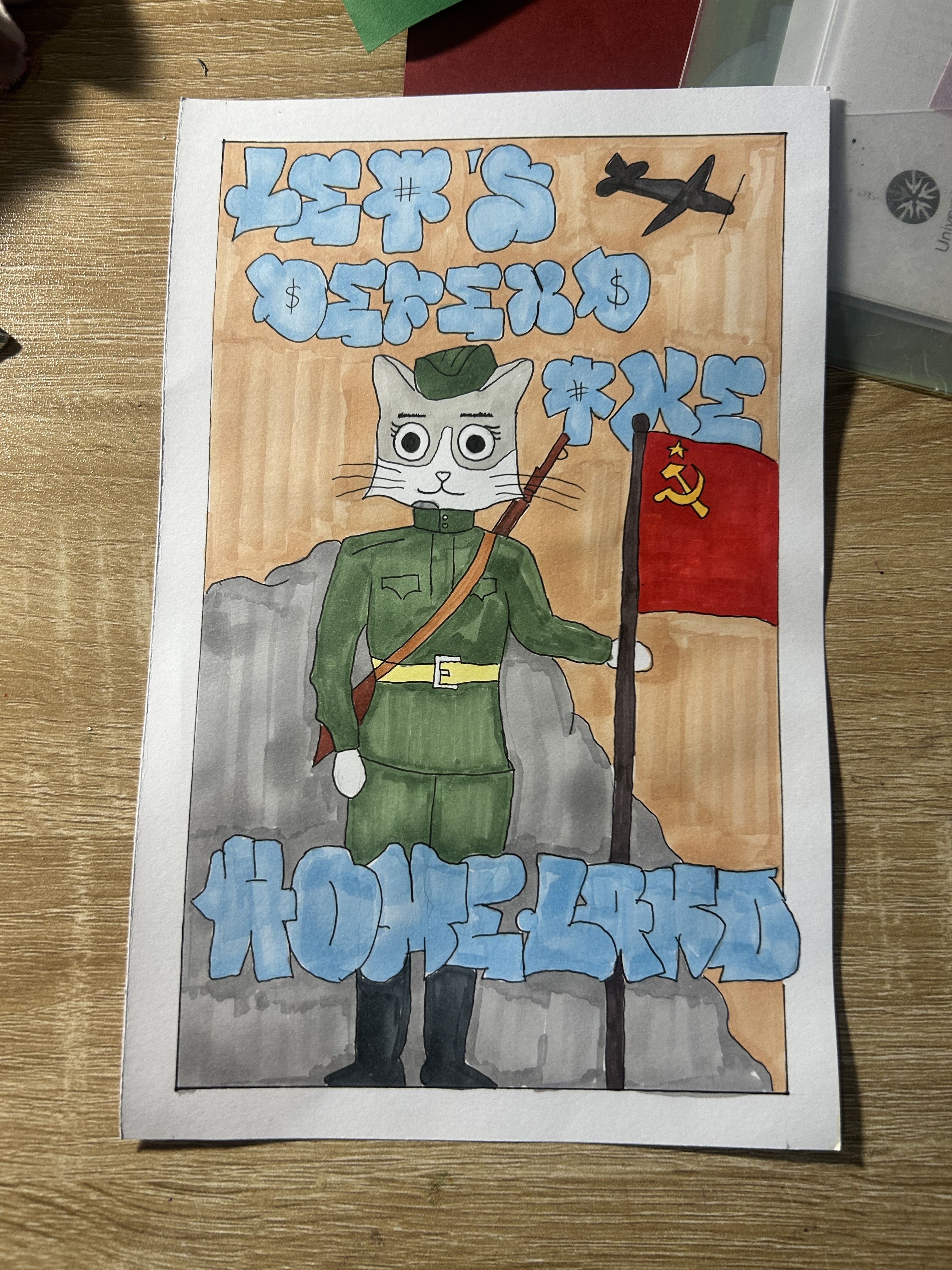 En el marco de la clase, los alumnos desarrollaron un ejercicio creativo inspirado en esta época. Utilizando personajes originales que diseñaron previamente, adaptaron sus estilos al lenguaje visual de los carteles de propaganda de la Segunda Guerra Mundial.