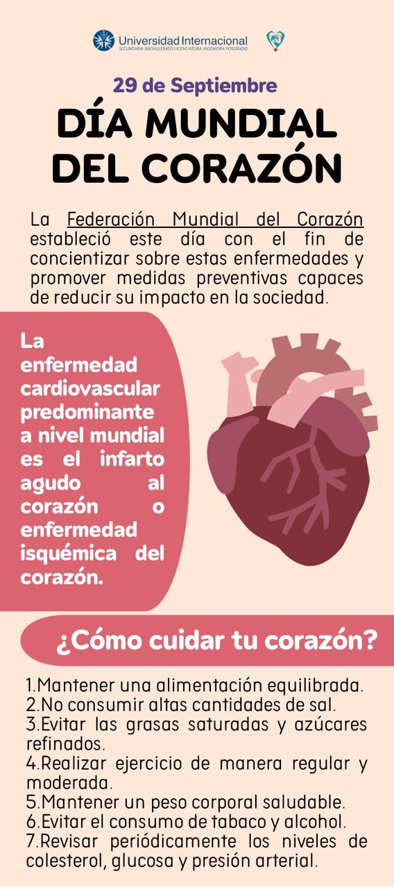 La Federación Mundial del Corazón estableció este día con el fin de concientizar sobre las enfermedades cardiovasculares (ECV) y promover medidas preventivas capaces de reducir su impacto en la sociedad. Esta fecha es crucial, ya que sirve para recordarnos la importancia de cuidar este órgano vital, ya que las enfermedades cardiovasculares son la principal causa de muerte en todo el mundo y México no es la excepción. Las enfermedades cardiovasculares pueden estar originadas por múltiples factores: desde el tabaquismo a la diabetes pasando por la presión arterial alta y la obesidad, la contaminación del aire o patologías menos comunes.