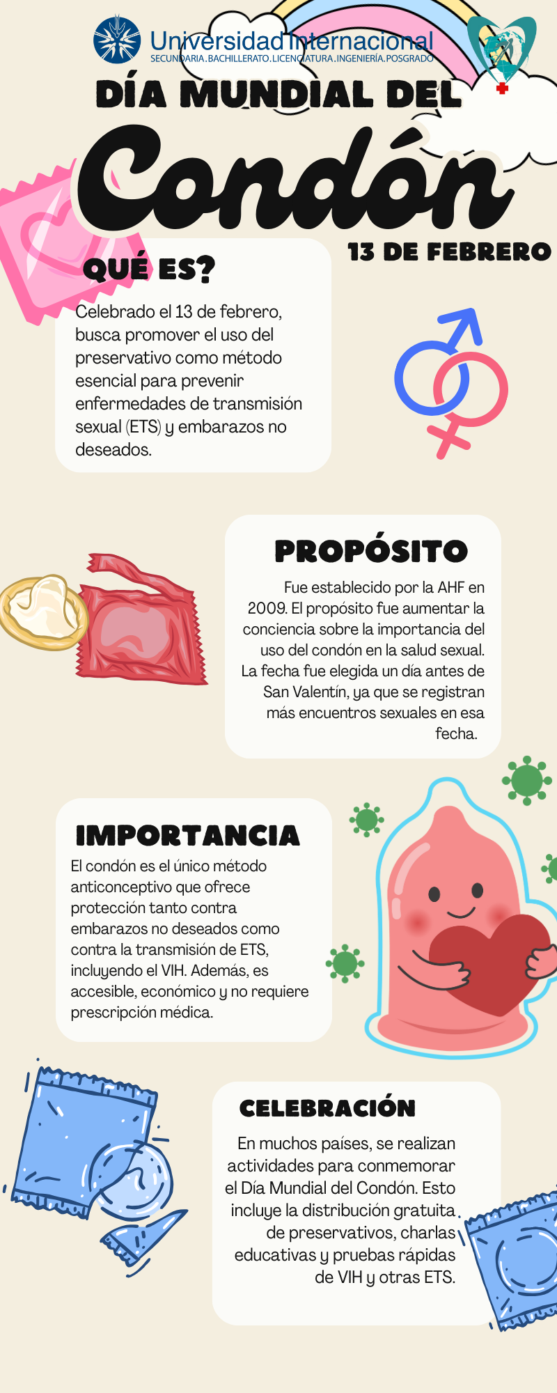 El Día Mundial del Condón se celebra cada 15 de febrero con el objetivo de promover la educación sexual y la prevención de enfermedades de transmisión sexual, así como de embarazos no planeados. Hablar de este tema es importante, especialmente entre los jóvenes, ya que la información correcta ayuda a tomar decisiones responsables. El Día Mundial del Condón fue establecido por la Fundación para el Cuidado del Sida (AIDS Healthcare Foundation, AHF,) con el propósito de informar a la población sobre la importancia del uso del condón como método anticonceptivo, prevenir las ETS e incrementar su acceso a nivel global.