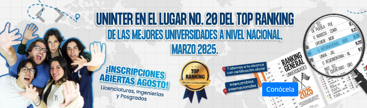 En el corazón de Cuernavaca, Morelos, con un campus moderno, acogedor y lleno de vida cultural, Uninter se ha posicionado como una de las 20 mejores universidades a nivel nacional en México, y no lo decimos solo nosotros: lo avalan rankings y resultados académicos que colocan a sus egresados en puestos de liderazgo en el país y en el extranjero.