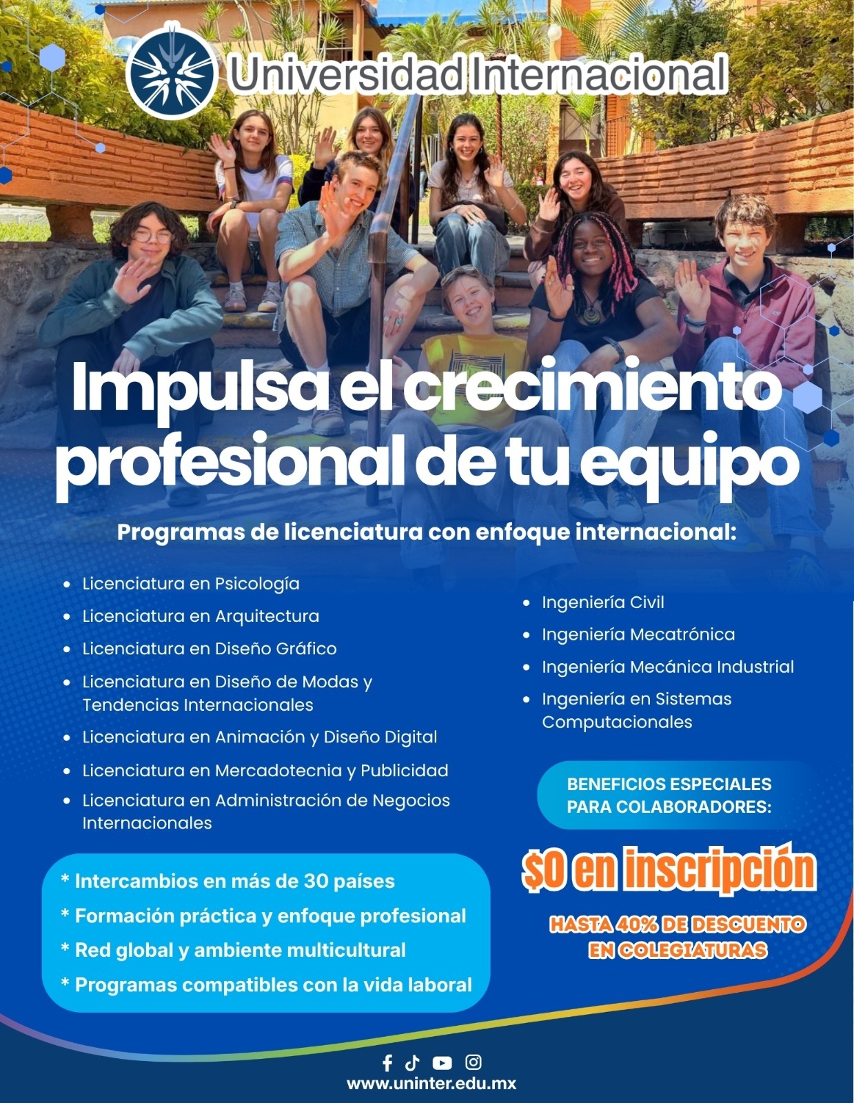 La Universidad Internacional ofrece programas de licenciatura con enfoque internacional, diseñados para formar profesionales preparados para los retos globales 🌎✨ Con opciones en áreas creativas, administrativas e ingenierías, tus colaboradores podrán desarrollarse con una formación práctica, intercambios en más de 30 países y un ambiente multicultural. 🚀 Además, aprovecha beneficios exclusivos como $0 de inscripción y hasta 40%…