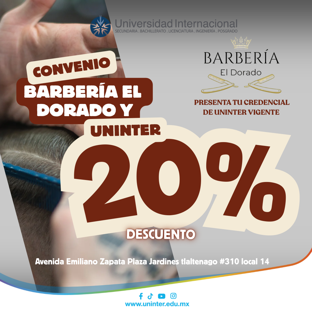 Disfruta de nuestro convenio junto a BARBERÍA EL DORADO💈💇 20% de descuento presentado tu credencial vigente de UNINTER🏢🪪