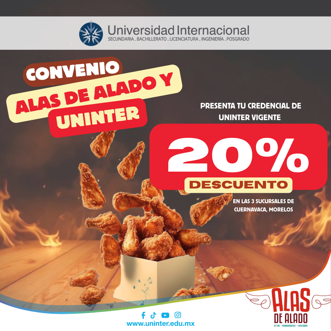 🎓✨ ¡Ser estudiante de UNINTER tiene más ventajas de las que imaginas! Gracias al convenio con Alas de Alado, presentando tu credencial universitaria podrás disfrutar de un 20% de descuento en tu orden. 🍗🔥 Aprovecha este beneficio, comparte con tus amigos y saborea las mejores alitas mientras sigues guiando tu futuro. 🚀