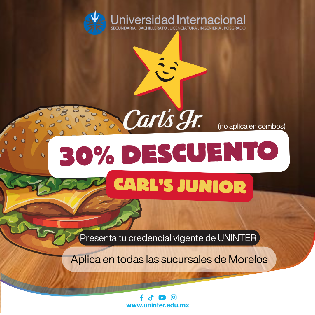 ¡Estudiantes UNINTER! 🤩 Disfruta de un 30% de descuento en Carl’s Jr. 🍔 ¡Aprovecha este gran beneficio! (No aplica en combos).