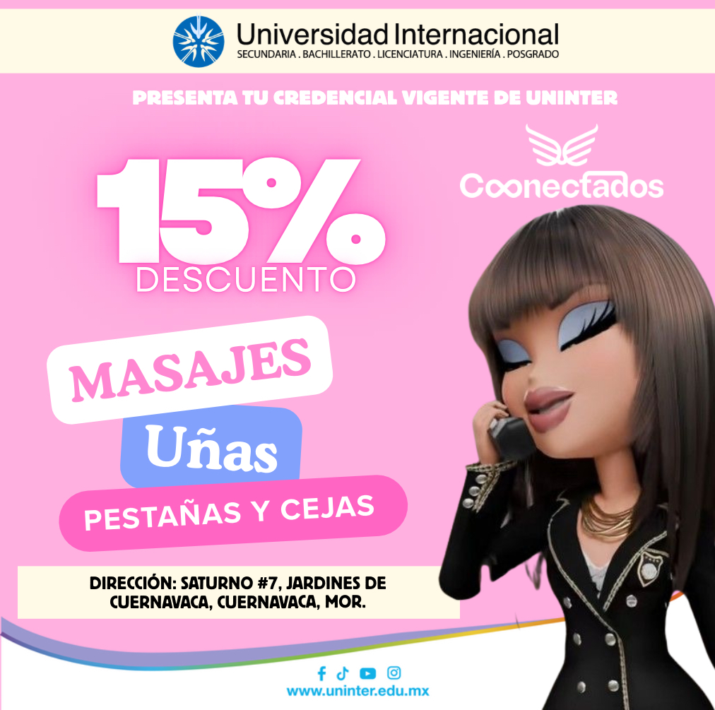 ¡Comunidad UNINTER, a consentirse! 💖 Por ser parte de Uninter, obtén el 15% de descuento en Masajes, Uñas, Pestañas y Cejas en Conectados. ¡Mereces un descanso! 🧖♀️ 📍 Dirección: Saturno #7, Jardines de Cuernavaca. #UNINTER #Convenio #DescuentoEstudiantil