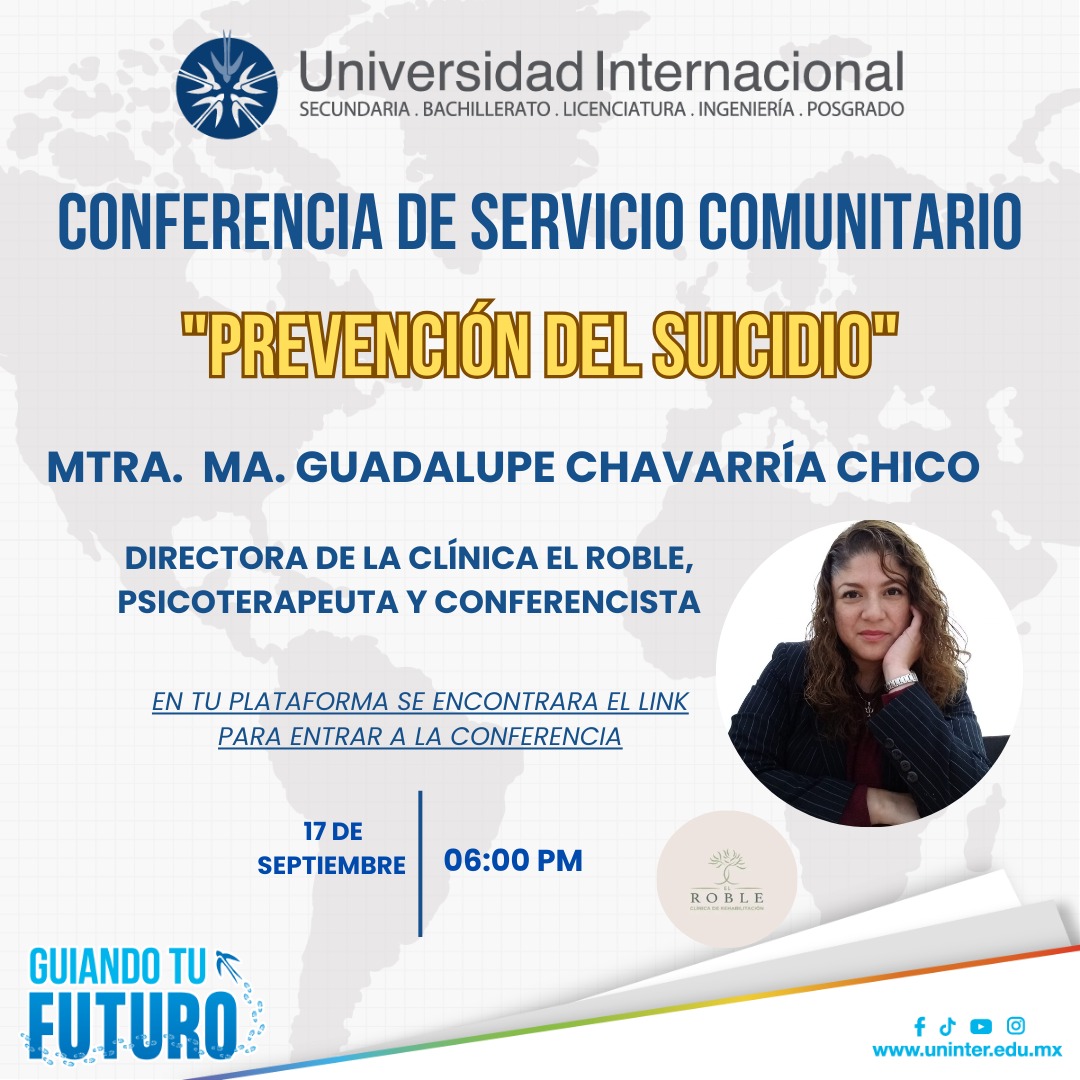 Queremos invitarte a ser parte de la primer conferencia de Servicio Comunitario: “Prevención del Suicidio”.Será un espacio de reflexión 🤔, información y apoyo, donde aprenderemos juntos🫱🏻🫲🏽 cómo cuidar nuestra salud mental y la de quienes nos rodean.Tu presencia puede marcar la diferencia 😌. !Te esperamos¡
