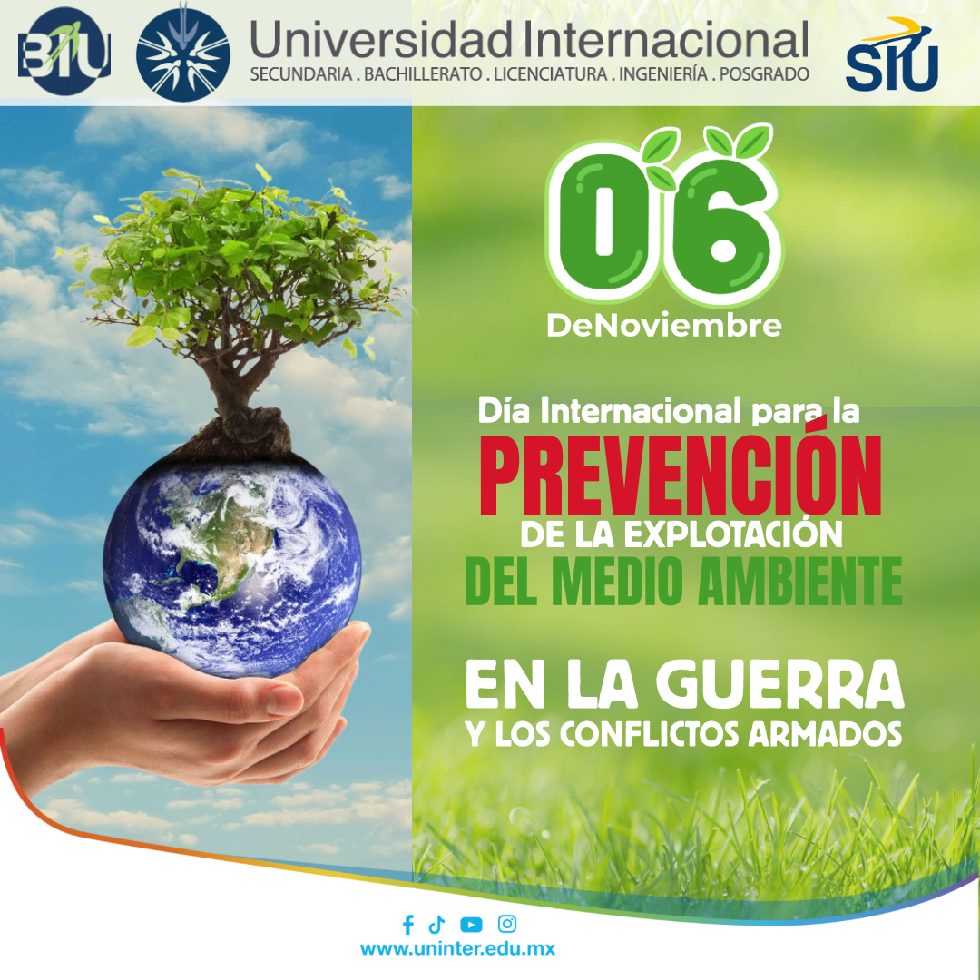 Día Internacional para la Prevención de la Explotación del Medio Ambiente en la Guerra y los Conflictos Armados. Recordamos el impacto devastador que tienen los conflictos armados en nuestros ecosistemas. Proteger la Tierra es un compromiso fundamental. #UNINTER #DíaInternacional #ConcienciaAmbiental